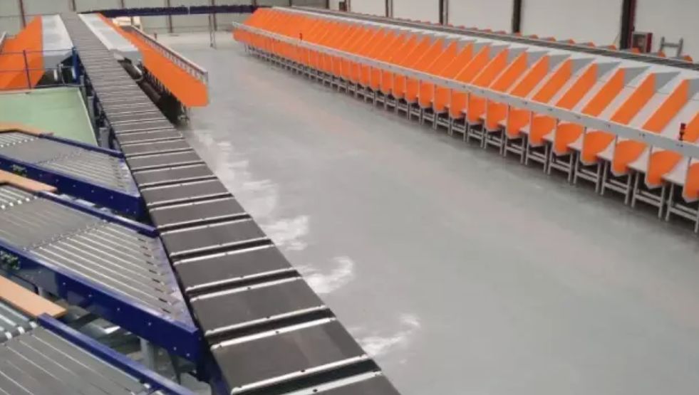 交叉帶分揀機(jī),交叉帶分揀機(jī)有很多種型式,比較普遍的為一車雙帶式,即一個(gè)小車上面有兩段垂直的皮帶,既可以每段皮帶上搬送一個(gè)包裹也可以兩段皮帶合起來(lái)搬送一個(gè)包裹。在兩段皮帶合起來(lái)搬送一個(gè)包裹的情況下,可以通過(guò)在分揀機(jī)兩段皮帶方向的預(yù)動(dòng)作,使包裹的方向與分揀方向相一直以減少格口的間距要求。優(yōu)點(diǎn):噪音低、可分揀貨物的范圍廣,通過(guò)雙邊供包及格口優(yōu)化可以實(shí)現(xiàn)單臺(tái)最大能力約2萬(wàn)件每小時(shí)。缺點(diǎn):造價(jià)比較昂貴、維護(hù)費(fèi)用高。