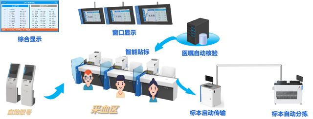 采血流程:患者到窗口采血-掃碼或讀就診卡-核對(duì)檢驗(yàn)項(xiàng)目-打印標(biāo)簽-選擇試管-粘貼試管-護(hù)士采血。人工采血存在問題人工選管、打印、粘貼,勞動(dòng)強(qiáng)度大。容易出現(xiàn)人為錯(cuò)誤。貼歪、貼倒(不能識(shí)別)。位置錯(cuò)誤(流水線無法識(shí)別)。視窗覆蓋(無法觀察血液情況)??赡艹霈F(xiàn)漏采或多采血。智能采血設(shè)備解決采血人的排隊(duì)難題,智能采血管理系統(tǒng)把采血管的準(zhǔn)備工作自動(dòng)化,縮短等待時(shí)間。采血流程需要全面的優(yōu)化,報(bào)到取號(hào),65歲以上老人優(yōu)先。智能叫號(hào)不需要長(zhǎng)時(shí)間的排隊(duì)。采血管容量大,處理速度快,能有效加快采血速度,提高采血服務(wù)質(zhì)量。自動(dòng)化代替了傳統(tǒng)人工的操作模式。自動(dòng)識(shí)別自動(dòng)貼標(biāo),自動(dòng)標(biāo)本核收。大大的減少人工誤差。也減少繁雜的采血前準(zhǔn)備,系統(tǒng)具有諸多優(yōu)勢(shì),將為客戶帶來全新的體檢體驗(yàn)。