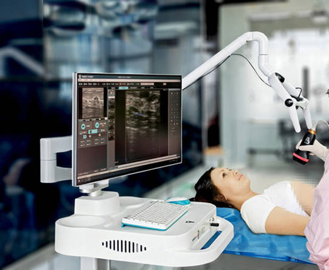 乳腺超聲設備自動乳腺超聲診斷,超聲技術讓廣大女性有舒適快速的乳腺超聲檢查。檢查開始的時候,首先在乳腺超聲設備的工作列表輸入患者的信息,簡單直觀的軟件操作界面可以快速的輸入受檢人信息。并且選擇適當?shù)膾呙枭疃群蛼呙桧樞颉H⊙雠P位海綿墊放在后背和臀部下面。并且在肩膀后面放枕頭幫助定位。固定成檢查有利姿勢,有助于乳頭朝向天花板。使乳腺組織均勻分布,正常的擺位是高質(zhì)量,可回顧性檢查的必要條件。