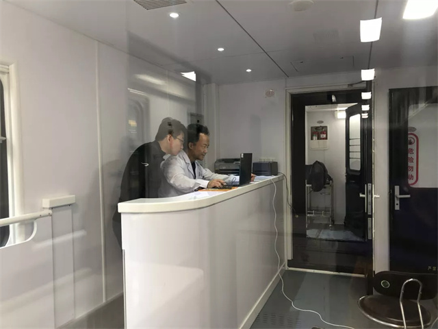 體檢車(chē)上都有這些檢查室?車(chē)廂里有男女彩超室,男女心電圖室,內(nèi)科、外科以及,骨密度、碳十三檢測(cè)室等,可以對(duì)血常規(guī)、肝膽功能,腎功能、空腹血糖、尿常規(guī),心電圖、肝膽胰脾B超等項(xiàng)目進(jìn)行檢查。車(chē)上都有這些功能室?候診登記處可以在候診區(qū)等待就診,各類(lèi)醫(yī)療用品和采樣冷藏柜也很完善。體檢車(chē)廂配置了全自動(dòng)生化分析儀、全自動(dòng)尿液分析儀、B超檢查室、心電圖檢查室等,可以進(jìn)行前臺(tái)導(dǎo)診、采血、尿液檢查、實(shí)驗(yàn)室化驗(yàn)、DR拍攝、超聲心電檢查等項(xiàng)目,能夠?yàn)槁毠みM(jìn)行全面體檢,最快當(dāng)天即可出結(jié)果。