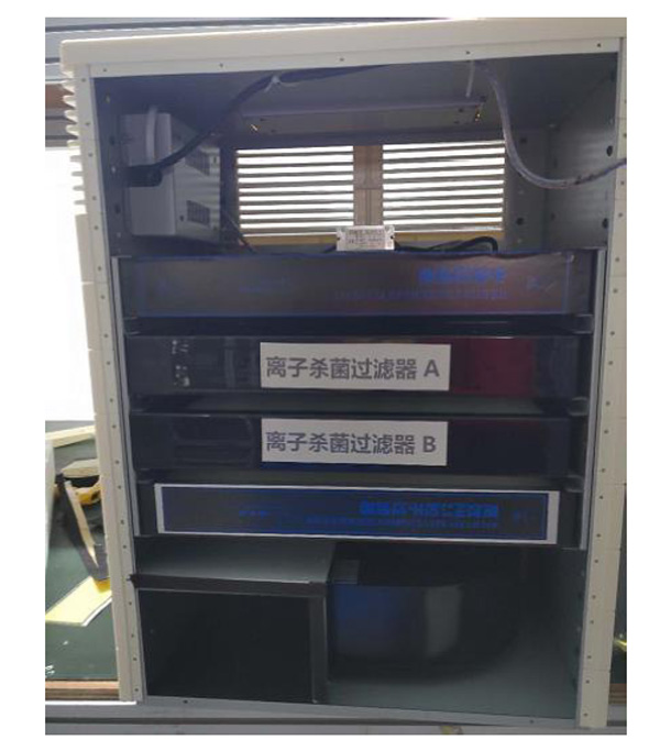 (1)箱體,(2)初級濾器,(3)出風(fēng)網(wǎng)板,(4)高效過濾器,(5)離子殺菌過濾器A 6離子殺菌過濾器B(7)薄型風(fēng)機(jī)