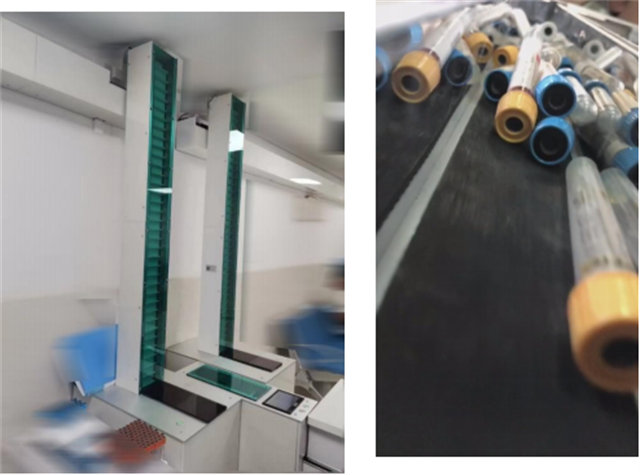采血試管自動(dòng)化傳輸平穩(wěn)準(zhǔn)確的傳到各個(gè)位置,前段的試管跟貼標(biāo)機(jī)系統(tǒng)和后端分揀機(jī)的系統(tǒng)實(shí)現(xiàn)對(duì)接。